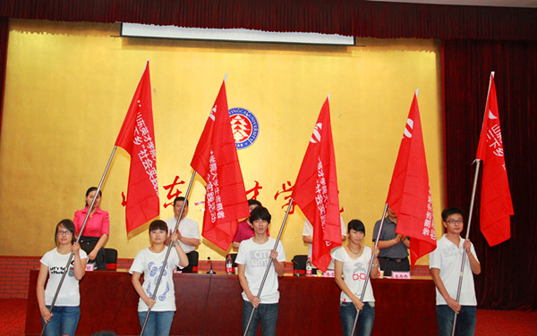 随后,杨文董事长等领导为2014年暑期“三下乡”省级重点团队和西部计划志愿者服务团授旗,鼓励参加社会实践的同学深入基层,围绕支教、理论政策宣讲、科技支农、文化艺术服务、环境保护等为重点开展社会实践活动;鼓励奔赴西部从事志愿服务的志愿者唱响到西部、到基层、到祖国最需要的地方建功立业的青春主旋律。