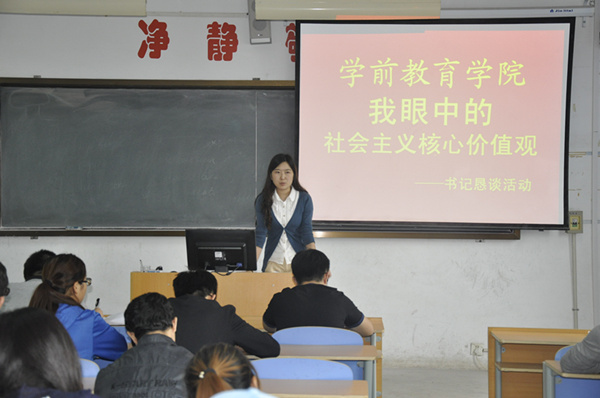 为培育和弘扬社会主义核心价值观,学前教育学院基层团委书记王坤丽,于9月16日中午11:30在A-3004召开以“我眼中的社会主义核心价值观”为主题的书记恳谈会,参加本次会议的是学前教育学院基层团委、学生会所有部门负责人。