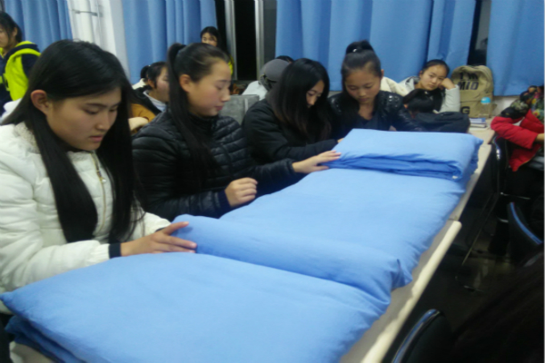 活动开始,16级辅导员老师先向学生介绍了山东英才学院文明宿舍评比的历史,起始缘由以及所取得的成果。随后,向学生介绍了2014级和2015级的学长学姐们在医学院领导的指导带领下荣获星级宿舍的荣誉,并随之向学生展示了优秀宿舍的照片,紧接着提出了些大学生宿舍整理的基本要求。例如:被子需成“豆腐块”,地面干净整洁,墙壁不能出现污垢,行李箱摆放整齐等等。随后在辅导员老师的倡导下开始了叠被子比赛。作为宿舍文化的重点内容“豆腐块”成为每个同学的必学内容。同学们利用每个宿舍带来的一床被子进行练习。被子压平,折起,成型后不断修整边边角角,一连串的动作被拆分成不同进行练习。通过不断的折叠,每位同学都完成了练习并一一通过老师的审核。在活动的最后,辅导员对此次活动做出了详细的点评。