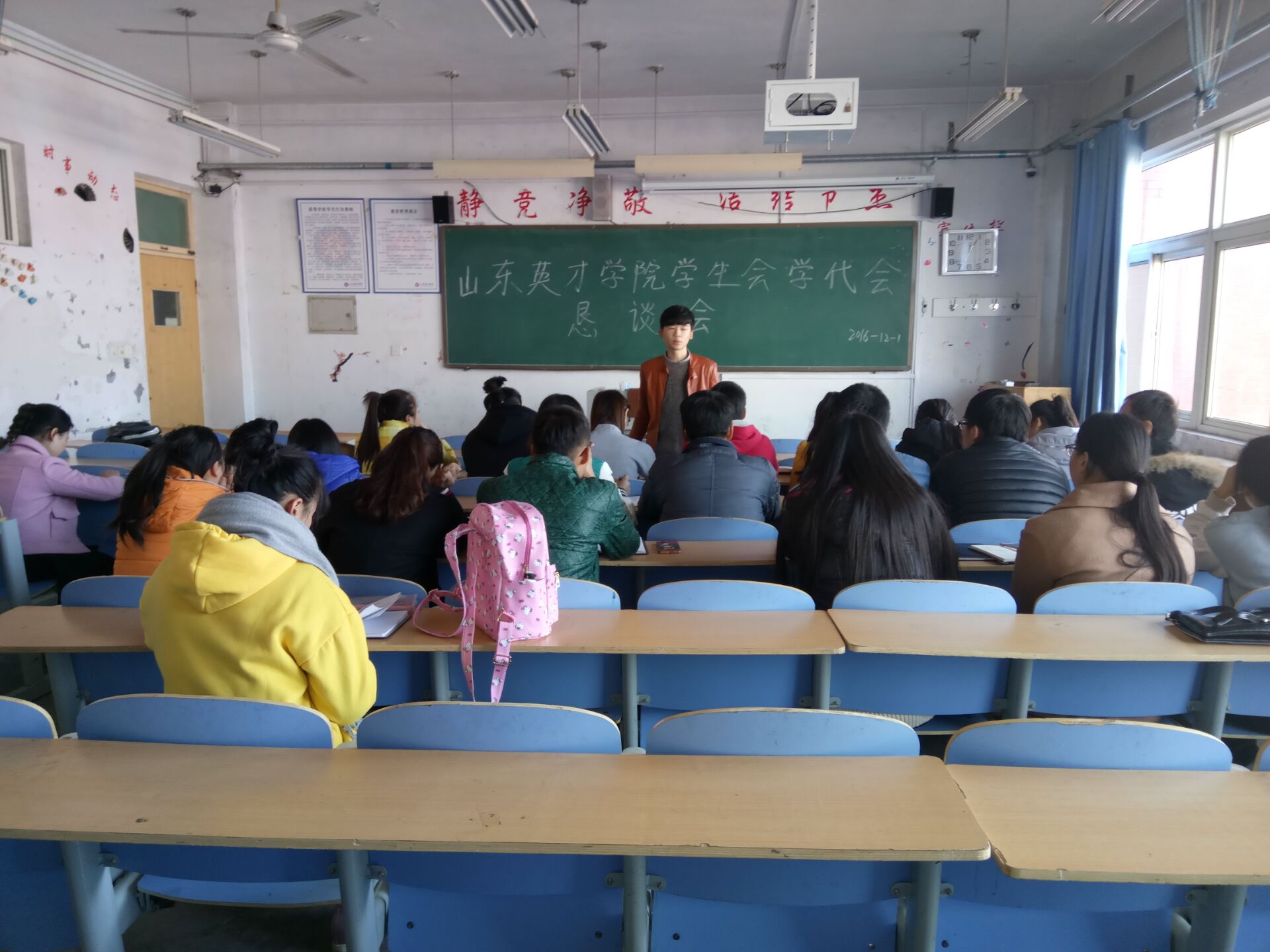 ,山东英才学院学生会于2016年12月1日在办公楼5005召开了以“聚焦学代会,共建美好校园”为主题的学代会恳谈会。山东英才学院学生会副主席赵希望出席此了次恳谈会,各部门部长和副部长及2016级学生干事参加了此次恳谈会。本次恳谈会由记者团部长赵娜主持。