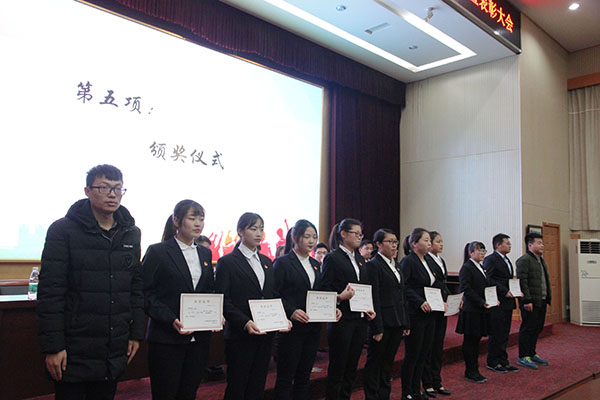 大会进行第一项,全体起立,奏唱国歌。在庄严的国歌带动下全体参会人员的激情澎湃。大会第二项,校团委社会实践部副部长姜鹏辉做年终工作汇报,细致总结了2017年校团委各项工作的进程及所获成果,表明了今后努力和改进的方向。大会第三项,青年志愿者协会会长梁栋做年终工作汇报,全面总结2017年工作经验,进一步抓重点、补短板、强弱项,为下一阶段工作开展指明了方向定下了目标。大会第四项,校团委社会实践部副部长高云丰宣读表彰决定,此时此刻的会场洋溢着火热的心情,传递着浓浓的欢喜。大会第五项,颁奖仪式。由老师、学生会副主席、校团委副部长、青年志愿者协会会长为获奖人员颁发荣誉证书,对他们给予了充分的肯定,高度的赞扬。会场掌声不绝,喝彩连连。大会第六项,赠锦旗仪式。梁栋会长上台授旗、姜鹏辉副部长、高云丰副部长接旗,以表示一年来,校团委社会实践部与青年志愿者协会紧密合作,出色完成在青年志愿者协会蓝天行动、圆梦行动、敬老院、幼儿园志愿服务等活动中各项任务的感谢,感谢其给予的大力支持。大会第七项:校团委宣传部部长、科技创新部部长、青春创业服务中心主任刘超老师进行工作指导。指导讲话围绕“勤学、修德、思辨、务实”八字阐释人该如何由不成熟走向成熟,并以深刻的三个问题结束,引人深思。大会进行第八项,校团委社会实践部部长,青年志愿者协会指导老师周晓东老师讲话。老师深情表达了调岗后对这份工作的热情,对同学们一同共事的喜爱。她表示奋斗的青春最美丽,并要求各干事树立正确价值观,不迟于空想不误于能力,做有思想、有准备、勤奋拼搏永不言弃之人。最后,全体成员起立共唱英才之歌、大二部员同老师合影留念。参会人员有序离场,此次表彰大会圆满结束。