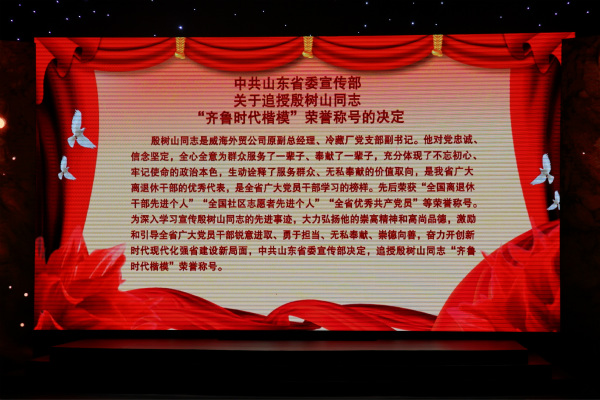5月25日晚,“齐鲁时代楷模”发布仪式在山东广播电视台融媒体资讯中心演播室举行,老党员殷树山被省委宣传部追授为“齐鲁时代楷模”。省委常委、宣传部长关志鸥,市委副书记、市长张海波,市委常委、宣传部长刘广华出席发布仪式,我校50名学生干部参加发布仪式。